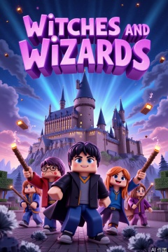 A movie poster for Witches and Wizards, showcasing blocky wizards with furry hair and square lightning scars, holding pixelated wands emitting square particles. In the background, the cubic Hogwarts castle stands prominently under a Minecraft-inspired logo. The film title appears in magical purple text, framed by vibrant colors and pixel art details. The composition uses a wide-angle shot to emphasize the iconic castle, with wizards centered in action poses. Keywords: wizards, pixelated wand, cubic castle, Minecraft style, purple text, magical particles, blocky design.