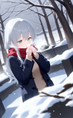 masterpiece,very aware,highres,absurdres,newest,best quality,high quality,chromatic_aberration,cinematic_angle,dutch angle,//,1girl,solo,long hair,enpera,scarf,coat,blurry foreground,red scarf,duffel coat,winter,blurry,outdoors,breath,own hands together,snow,tree,sweater,long sleeves,brown sweater,cold,blush,depth of field,black coat,open coat,grey hair,winter clothes,open clothes,open mouth,upper body,fringe trim,aqua eyes,hands up,bare tree,green eyes,blue coat,snowing,sparkle,blurry background,white hair,day,branch,sidelocks,looking down,hair between eyes,winter coat,parted lips,