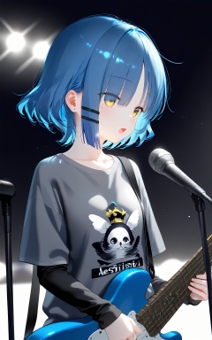 masterpiece,best quality,high quality,loli,overexposure,chromatic_aberration,light,fair_skin,//,yamada ryo,1girl,blue hair,bass guitar,microphone stand,instrument,solo,microphone,yellow eyes,shirt,short hair,white background,music,mole,simple background,holding instrument,mole under eye,holding,hair ornament,black shirt,long sleeves,eyes visible through hair,grey shirt,t-shirt,guitar,hairclip,upper body,collarbone,layered sleeves,open mouth,short sleeves,playing instrument,short over long sleeves,singing,//,very aesthetic,absurdres,newest,masterpiece,safe,amazing quality,(aestivation:2.4),(nasii:0.4),(toosaka asagi:0.4),(atdan:0.4),(iumu:0.72),(wlop:0.72),96YOTTEA,Konya Karasue,omone_hokoma_agm,//,official art,depth of field,detailed light,blurry background,best shadow,shiny skin,cinematic lighting,ray tracing,amazing quality,very aesthetic,absurdres,beast quality,ultra detailed,newest,8K,HDR,