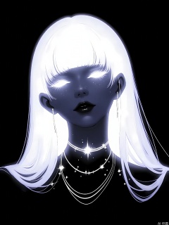 FSWL, Digital illustration of a young woman with long, straight, white hair and bangs. She has a blank expression, with her eyes glowing white and star-like sparkles around her face. She wears a black top and multiple thin necklaces with small star-shaped pendants. The background is black, making her glow stand out. The style is dark and moody, with a surreal, otherworldly feel. The image is high contrast, with a grainy texture. The woman's face is illuminated by the glowing effect, creating a mystical, dreamy atmosphere.
