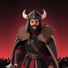 DDY, A digital artwork of a young man with a beard and a Viking helmet, wearing a fur cloak and holding an axe. He has a fierce expression with a battle cry, and his muscles are bulging with strength. The background is a gradient battlefield transitioning from dark red at the top to black at the bottom. The art style is cartoony and barbaric, with bold strokes and a rugged texture. The artist's signature "S. C1" is in the bottom right corner.