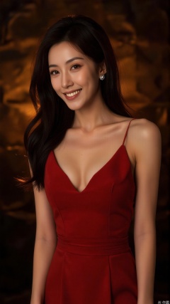 A sultry illustration of a stunning beauty wearing a sleek, sexy red deep-V dress that hugs her curves. Framed by a subtle gradient of golden light, the model's porcelain skin glows as she confidently strikes a pose against a rich, dark background. Her raven tresses cascade down her back like a waterfall of night, drawing attention to her radiant smile and piercing eyes that seem to sparkle like diamonds.,garter stockings,cinematic texture background