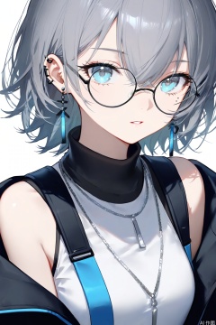 1girl, solo, looking at viewer, short hair, bangs, blue eyes, simple background, shirt, white background, hair between eyes, bare shoulders, jewelry, jacket, upper body, grey hair, earrings, parted lips, glasses, sleeveless, water, necklace, off shoulder, mole, black jacket, eyelashes, mole under eye, sleeveless shirt, piercing, ear piercing, round eyewear, eyewear strap
