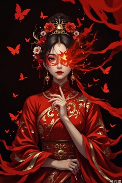 The image depicts a woman dressed in traditional attire, with a striking red color scheme dominating her outfit. She is adorned with intricate gold jewelry, including a headpiece and earrings. Her face is partially obscured by a decorative mask, which is intricately designed with a butterfly motif. The background is dark, enhancing the contrast of her vibrant attire and the glowing butterfly on her mask. There are also delicate, red butterflies floating around her, adding to the ethereal and mystical atmosphere of the scene.