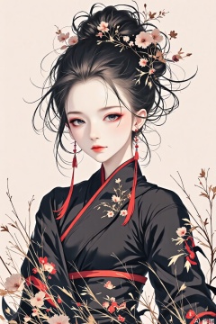 The image depicts a beautifully illustrated character with intricate details. The character has long, dark hair styled elegantly, adorned with delicate floral accessories and red tassels. Their eyes are large and expressive, with subtle makeup enhancing their features. They are wearing a traditional outfit with a black robe featuring a red inner lining and a floral design on the collar. The background is plain, allowing the focus to remain on the character.
