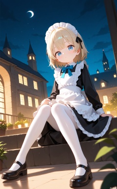 1girl, solo, looking at viewer, long sleeves, dress, bow, sitting, full body, outdoors, frills, shoes, alternate costume, footwear, apron, maid, maid headdress, night, white apron, mary janes, maid apron, enmaided, pantyhose,
