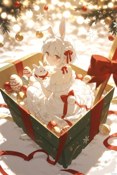 loli, 1girl, snow rabbit, red eyes, animal ears, solo, snowflakes, dress, rabbit ears, sitting, white hair, white dress, rabbit, pantyhose, looking at viewer, christmas ornaments, bow, red bow, short hair, holding, white choker, white pantyhose, gift, rabbit tail, looking back, tail, pom pom (clothes), white footwear, box, closed mouth, christmas, ribbon, hairband, red ribbon, hair bow, blush, white hairband, backless dress, animal, rabbit girl, from above, pleated dress, hair ornament, headdress, hair between eyes, backless outfit, from behind, christmas lights, full body, bell, food, easter egg, choker, ballet slippers, frilled hairband, holding animal, shoes, frilled dress, layered dress, gift box, back bow, blurry, easter, frills, snow, fake animal ears, snowflake background, depth of field, bare shoulders, off-shoulder dress, sleeveless dress, pom pom hair ornament, looking up, snowflake print, hair ribbon
