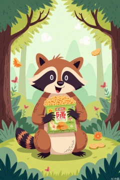 Cartoon illustration, Create a vibrant and whimsical digital illustration in a playful cartoon style. A little raccoon is eating a crispy noodle snack. The raccoon has a cute expression with its mouth open wide, holding the guì qián miàn (crispy noodle snack) with both paws. The snack packaging is brightly colored with various patterns and text labels. The background features a gradient of green and brown, with tree branches and leaves surrounding the raccoon, adding a natural and lively atmosphere.