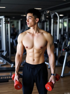 photo, A ripped, shirtless Asian dude with short black hair stands in a gym, clutching two red dumbbells. He's rocking black workout pants and a watch on his left wrist. The gym's got a modern vibe with shiny metal gear and wooden floors in the background.