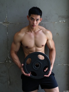 photo, A ripped, shirtless young dude with short, dark hair, holding a black 15-pound weight plate. He's got a light skin tone, and his muscles are seriously defined. He's standing in front of a concrete wall, looking all serious and focused. He's wearing black shorts. The lighting is soft and natural, making his body's contours pop..