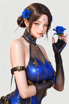 score_9,score_8_up,score_7_up,1girl,gloves,solo,green eyes,blue flower,jewelry,forehead mark,hair ornament,brown hair,earrings,flower,looking at viewer,facial mark,hair flower,blue rose,elbow gloves,hair bun,fingerless gloves,white background,breasts,blue dress,black gloves,rose,closed mouth,necklace,simple background,arm strap,<lora:N步练师保卫者THV3:0.8>,