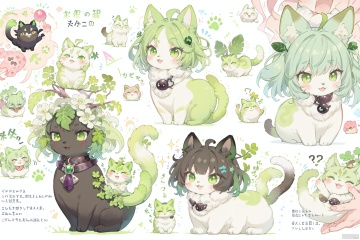 The image features three stylized characters resembling cats, each with distinct colors and designs. The first cat on the left is white with green accents, resembling a cat with a light green tail and green markings on its face. The second cat in the center is red, with green markings on its face and body, and a green tail. The third cat on the right is black with green markings on its face and body, and a green tail. Each cat is surrounded by green leafy plants, and there are paw prints and text in Japanese around them. The text includes the names "Red Radish" and "Kuro," and descriptions of the characters' appearances and characteristics. The overall design is whimsical and colorful, with a focus on the characters and their natural surroundings.Vegetable Fairy