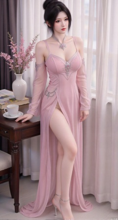 Ultra clear, wallpaper, 8k, masterpiece, 1girl, solo, long hair, Upper Body, looking at viewer, bangs, large breasts,long dress,Pink clothes, bare shoulders, jewelry, black hair, standing, purple eyes,, flower, thighs, indoors, hair bun, long dress, high heels, cup, see-through, book, bare legs, window, table, white footwear, standing on one leg, curtains, pink flower, side slit, vase, ,(huge breasts:2.99),(full breasts:2.99),phone screen,XanmiaoyiY,XhuolingerHHY,XwangqiuerKQW,Xxuenv,Xnanqiuqiu,Xhuangnv,XchuxuanerX,XchuxuanerXY,XyunyunX