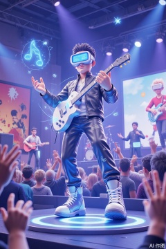 A vivid 3D illustration of a musician wearing augmented reality glasses, performing in a virtual concert hall. He holds a holographic guitar, strumming along to a catchy tune. The concert hall is illuminated by stage lights and filled with virtual audience members. The background includes a virtual band and a wall painted with a mural of musical instruments. The musician is dressed in a flashy, stage-ready outfit and stylish boots. The overall aesthetic is lively and energetic, with a focus on music and performance.