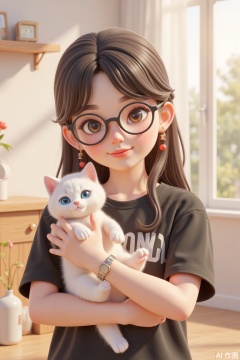 A girl with long-haired hair wearing black framed glasses and red pearl earrings, wearing a black short-sleeved T-shirt and holding a white cat in her arms. The cat has big blue eyes, pink nose, and cute and agile manner. The background is soft and light colors, the picture lines are smooth and delicate, and the color matching is harmonious. Through vivid character creation and warm scene arrangement, a healing and warm atmosphere is created, conveying the intimate and beautiful emotions between people and pets, and showing delicate emotional expression and aesthetic texture.