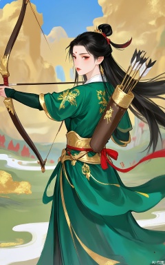LJCH, Chinese ink - style digital illustration of a noble - born archer with long, tied - back black hair, wearing a green and gold armor with a quiver of arrows on her back. She is standing on a hilltop, aiming her bow at a distant target. The background is a vast grassland with rolling hills and a golden - hued sky at sunrise. Her expression is focused and determined, her eyes fixed on the target. The illustration has a heroic and adventurous feel, with bold ink lines and gold accents on the armor.