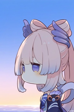 solo, 1girl, pink_hair, sangonomiya_kokomi, purple_eyes, long_hair, no_humans, from_side, sky, bare_shoulders, water