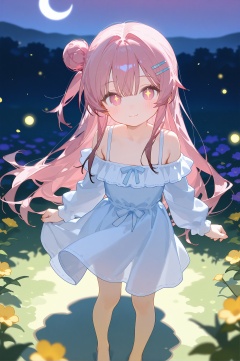 (masterpiece) (best quality) illustration ultra detailed hdr Depth of field (colorful) loli a girl full body Magic focus masterpiece solo gradient background summer best quality star Through the mottled light and shadow of flowers deep night wind flying flowers colorful flowers fireflies crescent moon 1 girl pink long hair Beautiful and meticulous eyes small breast beautiful detailed off shoulder beautiful dress pink highlights hairpin long sleeves perfect hand strong rim light anime screenshot bare feet solo focus extremely detailed wallpaper Personage as the main perspective intense shadows cinematic lighting depth of field painting girl glow lines LU Hazy light Floodlight