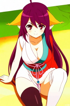 1girl, solo, long hair, breasts, looking at viewer, large breasts, red eyes, thighhighs, animal ears, cleavage, very long hair, purple hair, ahoge, japanese clothes, kimono, sash, antenna hair, single sleeve,masterpiece,best quality,official art,extremely detailed CG unity 8k wallpaper,,Thigh exposed,thighhighs,looking at viewer,on the beach,