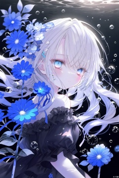 best, 1girl, solo, flower, blue flower, blue eyes, hair ornament, looking at viewer, off shoulder, long hair, off-shoulder dress, bubble, upper body, dress, white hair, bare shoulders, hairclip, black dress, closed mouth, blue ribbon, off-shoulder shirt, rose, ribbon, water drop, air bubble, floating hair, hair flower, hair between eyes, black background, tears, black shirt, multicolored eyes, blue rose, blush, looking to the side, frills, from side, shirt, crying with eyes open, looking back, underwater, frilled dress, grey hair, crying, dark background, floral background, white flower, gradient eyes, pale skin, gradient background, blue theme, eyelashes, blurry, expressionless, simple background, breasts, swept bangs, teardrop