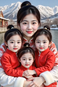 Real photography of a person with big eyes, double eyelids, fair skin, ponytail, a 25-year-old girl and two little girls taking pictures outdoors, sitting in the snow. The background is a small village by the river, with a bluestone path on the shore, a fishing boat on the water in the distance, and a mountain peak in the distance. The top of the mountain is covered with snow.whole body