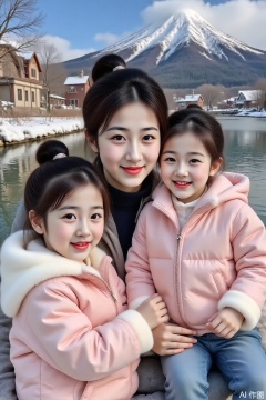 Real photography of a person with big eyes, double eyelids, fair skin, ponytail, a 25-year-old girl and a little girl taking pictures outdoors, sitting in the snow. The background is a small village by the river, with a bluestone path on the shore,  and a mountain peak in the distance. The top of the mountain is covered with snow.whole body*1.5