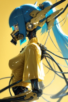 masterpiece,best quality,amazing quality,very aesthetic,absurdres,newest,extreme aesthetic,in the style of fashion photography,light particles,cinematic lighting,Visual impact,sharp focus,Emotionalization,depth of field,dutch angle,scenery,1girl,solo,long_hair,breasts,bangs,simple_background,shirt,medium_breasts,blue_hair,jacket,yellow_eyes,upper_body,ponytail,short_sleeves,shiny,blunt_bangs,from_side,profile,mask,headgear,yellow_background,yellow_shirt,android,joints,cable,yellow_jacket,mechanical_arms,cyborg,robot_joints,yellow_theme,cyberpunk,mechanical_parts,respirator,mechanical_ears,