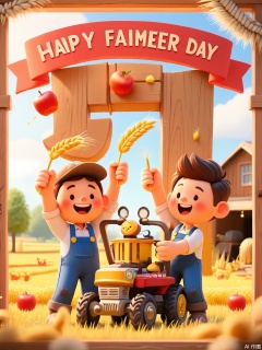 LDJ, A 3D-rendered cartoon poster of smiling farmers in denim overalls harvesting wheat, using a combine tractor shaped like a smiley face. The scene includes a barn decorated with "Happy Labor Day" banners, sunflowers, and floating apple motifs in warm golden-yellow tones.