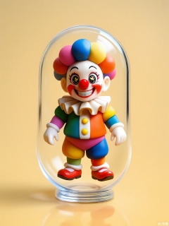 SBJN, Photo of a small figurine of a clown with a red nose and a big smile, wearing a colorful outfit. The figurine is held in a clear glass capsule by a hand, with a light yellow background. The clown has a cheerful expression, with large sparkling eyes and a wide grin. The lighting is soft and even, highlighting the details of the figurine. The style is realistic, with a focus on the details and textures of the figurine and the glass capsule.
