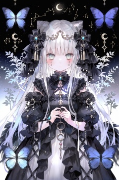 butterfly,blue butterfly,1girl,bug,solo,dress,long hair,looking at viewer,black nails,bow,black bow,lolita fashion,black dress,blush,hair bow,white hair,constellation,star (sky),moon,nail polish,cone hair bun,straight-on,facial mark,crescent,hair bun,blue eyes,hair ornament,jewelry,gothic lolita,own hands together,closed mouth,long sleeves,night,frills,expressionless,tassel,night sky,cowboy shot,detached sleeves,frilled dress,puffy sleeves,grey hair,black ribbon,ribbon,double bun,starry sky,blunt bangs,crescent moon,very long hair,bowtie,sky,star (symbol),black bowtie,headdress,fingernails,two-tone dress,circlet,plant,white dress,green eyes,gradient background,layered dress,black background,standing,gem,wide sleeves,sidelocks,animal,grey eyes,wings,ring,cross-laced clothes,upper body,aqua eyes,black sleeves,key,leaf,flower,headpiece,juliet sleeves,facial tattoo,hair ribbon,cross,frilled sleeves,full moon,<lora:lp29New.up2.1-000030:0.9>,