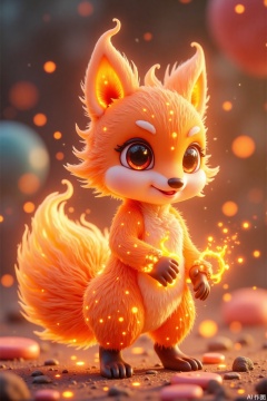 Soft and cute little fox, fluffy orange-red flame tail with starry spots, round body consisting of small beating flames, watery big eyes surrounded by golden fire rings, claws step on rotating mini flame gears, background with candy-colored clouds and rainbow fire bridges, cartoon rendering, macaron tones
