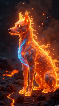 A fiery dog made of swirling flames, glowing orange and blue embers, dynamic sparks flying, hyper-realistic details, dark volcanic background with lava cracks, dramatic lighting, surreal fantasy art, trending on ArtStation, 8K resolution, intricate textures, --ar 16:9 --v 5.2