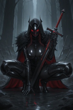 masterpiece,best quality,amazing quality,very aesthetic,absurdres,newest,highres,A dark atmospheric digital painting of a fearsome armored creature holding a large curved and serrated sword with a flowing dar cape crouching menacingly in a shadowy stormy landscape.,