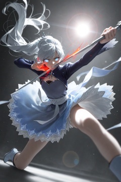 masterpiece,best quality,amazing quality,very aesthetic,absurdres,newest,in the style of fashion photography,light particles,cinematic lighting,Visual impact,sharp focus,Emotionalization,impactful picture,lens flare,depth of field,dynamic pose,dutch angle,extreme aesthetic,(dino_(dinoartforame):0.5),(yoneyama mai:0.5),(Yomu:0.3),(quasarcake:0.4),(wlop:0.3),1girl,weiss schnee,rwby,fighting_stance,weapons in hand,metallic texture,glowing_eye,eye flame smear,