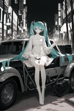 masterpiece,best quality,amazing quality,very aesthetic,absurdres,newest,highres,usa37107692,dino_(dinoartforame),beast_quality,masterpiece,8k,abstract,1girl,sitting,full_body_shot,solo,twintails,bag,phone,(multicolored_theme:1.5),miku,hatsune miku,holding,dress,outdoors,socks,ground vehicle,hair ornament,cellphone,night,bangs looking_at_viewer,neon,loose_sleeves,glitch_art,glitch_effect,black_background,scanlines,(monochrome:1.3),tall_trees,mystical_forest,grassy_pathway,neutral_expression,star_hair_accessory,foggy_background,stylish,soft_dark_theme,flowing_white_dress_with_translucent_layers,soft_glow,ethereal_aura,aesthetic_pixelation,ambient_mist,bioluminescent_glow_in_trees,faint_stardust,