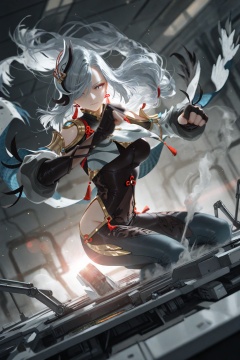 masterpiece,best quality,amazing quality,very aesthetic,absurdres,newest,light particles,sharp focus,Emotionalization,lens flare,depth of field,dynamic pose,dutch angle,extreme aesthetic,(dino_(dinoartforame):0.5),(yoneyama mai:0.5),(quasarcake:0.5),(wlop:0.5),1girl,shenhe,Science fiction,Mechanical desks and chairs,mechanical classrooms,mechanical institutions,Cyberpunk,Futuristic style,Steampunk,Punches,motion blur,smoke on the fist,