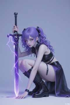 Shot from a low angle. There is a beautiful woman in thick painting style. She is squatting on the ground with one knee touching the ground. She holds a concept giant sword in one hand and inserts it into the ground. There are thunder and lightning elements on the sword. She has messy curly purple hair with bangs. Her facial features are exquisite, and her skin is fair. Her gray pupils exude a sense of coldness, and she has an icy white complexion. It is in 8K Ultra HD quality, with a 3D rendering. The semi-thick painting style highlights the texture. It combines elements of the dark and punk styles. The tone is relatively bright, and the pure color background is eye-protecting, which highlights the character as the main subject. At the same time, the character has rich details, from the hair strands to the accessories, all of which are exquisitely detailed. The overall atmosphere is mysterious and full of a rebellious spirit. The character's expression and posture are cold and unruly, conveying a strong sense of personality and rebellion. With a unique color scheme, elaborate character design, and simple background treatment, it creates a visual effect that is both mysterious and rebellious. In the style of CG anime thick painting, it is lifelike, extremely clear, in HD quality, and has a 3D stereoscopic effect. She has delicate eyes with colored contact lenses, a clean face, and dainty hands. Her bangs and stray hairs cover her eyes. It has a semi-realistic style. It shows the full body. She has long and straight legs, knee-high boots, and is tall. There is master-level lighting. She is wearing designed shorts.