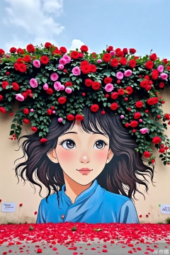 The image depicts a mural of a young woman with long black hair and a serene expression. She is wearing a blue garment. Her hair is adorned with vibrant red and pink roses, which cascade down her head and shoulders. The background is a light-colored wall, and the mural is surrounded by a lush arrangement of green foliage and red rose petals at the bottom. The sky above is clear with a few clouds, creating a peaceful and artistic atmosphere.