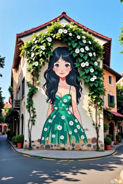 The image depicts a mural on the side of a building, featuring a woman dressed in a green dress adorned with white flowers. The mural is painted in a realistic style, with the woman's long black hair cascading down her shoulders. She is surrounded by lush green foliage, including large white flowers and vines that extend from the wall to the ground. The building itself has a rustic appearance, with a tiled roof and several windows, some of which have potted plants. The street in front of the building is lined with trees, and the sky above is clear and blue, suggesting a sunny day. The mural is a striking example of street art, blending seamlessly with the urban environment.