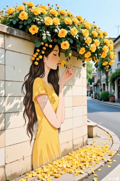 The image depicts a serene scene with a young woman wearing a yellow dress, standing against a white tiled wall. Her long, dark hair is adorned with yellow flowers, and she is gently blowing a yellow flower from her hand. The wall is covered with a lush, vibrant yellow rose bush that extends over it, creating a natural canopy. The ground in front of her is scattered with fallen yellow petals, enhancing the floral theme. In the background, a quiet street with a few buildings and greenery is visible, under a clear blue sky. The overall atmosphere is peaceful and harmonious, with a focus on the beauty of nature and the simplicity of the woman's interaction with the flowers.