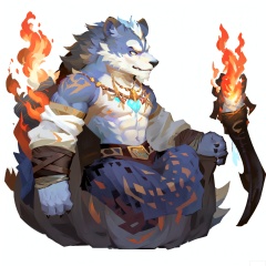 The image depicts a muscular, anthropomorphic creature resembling a panda, sitting in a dynamic pose. The creature has a dark, fur-covered body with a lighter, almost golden-brown fur on its back and tail. It is adorned with a fiery, flame-like design on its chest and shoulders, giving it a fierce and powerful appearance. The creature is wearing minimal clothing, consisting of a white cloth around its waist, which is illuminated by a blue glow. The background is plain white, emphasizing the creature as the focal point of the image.sdorica,(simple background,white background:1.2)