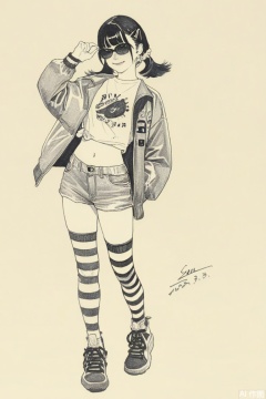 1girl, solo, shorts, striped, thighhighs, jacket, sunglasses, shoes, sneakers, striped thighhighs, full body, looking at viewer, hair ornament, smile, earrings, dated, twintails, midriff, navel, jewelry, shirt, adjusting eyewear, hairclip, bangs,