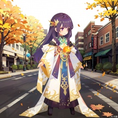 The image depicts a character with long purple hair, wearing a white and gold robe with intricate patterns. The character is standing in an urban environment with blurred buildings in the background, suggesting a city setting. The character's right hand is extended, emitting a glowing orb of light, which appears to be magical. Fallen leaves are scattered around, indicating an autumn season. The lighting is soft and warm, giving the scene a serene and magical atmosphere.sdorica,(simple background,white background:1.2)