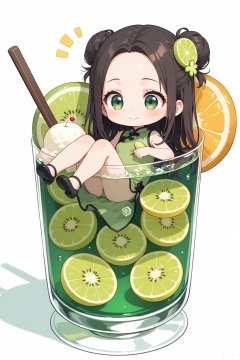 masterpiece, best quality,safe,1girl, lime (fruit), ice, food, ice cube, solo, chibi, white background, in cup, fruit, smile, drinking glass, black hair, mini person, simple background, ice cream, cup, , long hair, ice cream float, minigirl, hair ornament, glass, in container, blush, brown hair, in food, kiwi (fruit), dress, forehead , green dress, chinese clothes, , cherry, closed mouth, |_|, green eyes, drink(7010:0.5),,