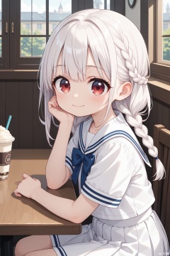 newest, latest, masterpiece, best quality, amazing quality, very aesthetic, absurdres,cute, cute round face, slender, detailed eyes, detailed hair, kawaii,1girl, solo,cowboy shot, from side,smile, closed mouth, looking at viewer,white hair, dark-red eyes, long hair with braids,white sailor school uniform, blue bowtie,sitting, in cafe, classic interiors, gothic furnitures
