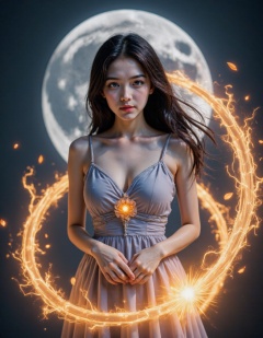 cinematic,photo-hdr,realistic,photorealistic,1girl,solo,upper body,dress,black hair,electricity,fire,flower,petal,flowing hair,gem,neatly circled around the girl in a single direction,dress,fire,flowing hair,burning,wrapped in flames,girl solo,abstract,full moon,