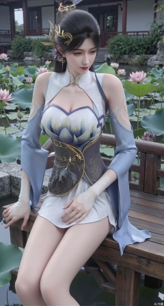 (masterpiece:1.2),best quality,a young woman sitting on a wooden bench in a pond with lily pads.The woman is posing with one hand on her hip and the other resting on the edge of the bench. The background is filled with pink and white lotus flowers and green leaves. The overall mood of the image is peaceful and serene,(huge breasts:2.99),(full breasts:2.99),(Background with traditional Chinese architecture, lotus pond and pink lotus flowers:1.39),XyunyunXY,Xmeining,Xjiangziyue,Xweinina,Xyunxiao,Xxiaoqingxue,Xlenhuan,Xhuajin,Xjiangbilan,XbaihehuaiX,Xyinxuehou