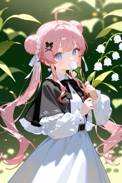 1girl blue eyes pink hair cat flower holding flower solo hair bun long hair white cat blush looking at viewer hair ornament holding long sleeves ahoge twintails dress bow x hair ornament white flower frilled sleeves double bun reaching sidelocks virtual youtuber bowtie reaching towards viewer hair bow frills chromatic aberration watermark white bow ribbon black dress white dress outstretched hand blunt bangs blurry background jewelry capelet artist name english text low twintails blue bow hairclip skirt blurry plant cowboy shot earrings puffy long sleeves black capelet open hand lily of the valley sample watermark black bow twitter username hair ribbon braid black skirt belt 2023 covering own mouth outstretched arm blue bowtie hair flower frilled dress puffy sleeves covered mouth collared dress blonde hair white ribbon qr code