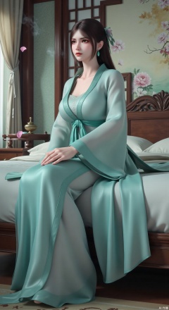 (masterpiece, best quality:1.2),Ancient Chinese boudoir scene, Hanfu dress ,sitting sideways on an intricately carved wooden bed, soft natural light filtering through sheer silk curtains, satin bedding with delicate sheen, detailed traditional Chinese Gongbi painting style, subtle celadon color palette, background featuring vintage dressing table and embroidered screen, falling plum blossom petals near window and wispy smoke from bronze incense burner, 8K resolution with intricate fabric draping and wood grain textures,,(huge breasts:2.99),(full breasts:2.99),,Xzhihua,Xsiyouyou,Xyanruyu,Xmoxiaonan,Xyeqingxian,Xyinxuehou,Xpoyuhou,XbaihehuaiX,Xjiangbilan,Xhuajin,XshengcaierY,Xmengyuyi,Xxiaomei,Xhujiaoer