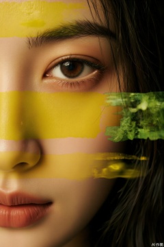 Ink painting, ultra-macro close-up, threshold space, one eye, abstract space, European girl, strong contrast between light and shadow, grainy sense of contrast, strong contrasting color collision, motion blur, visual shock, stunning, minimalist background, high-end sense, background green, yellow, large color block splicing, rough grainy feeling, + aesthetic, dream core, + fairy, blur, emotional atmosphere, mystery, deep dream, concept art, extremely decorative, fine art, masterpiece, story,double-exposure